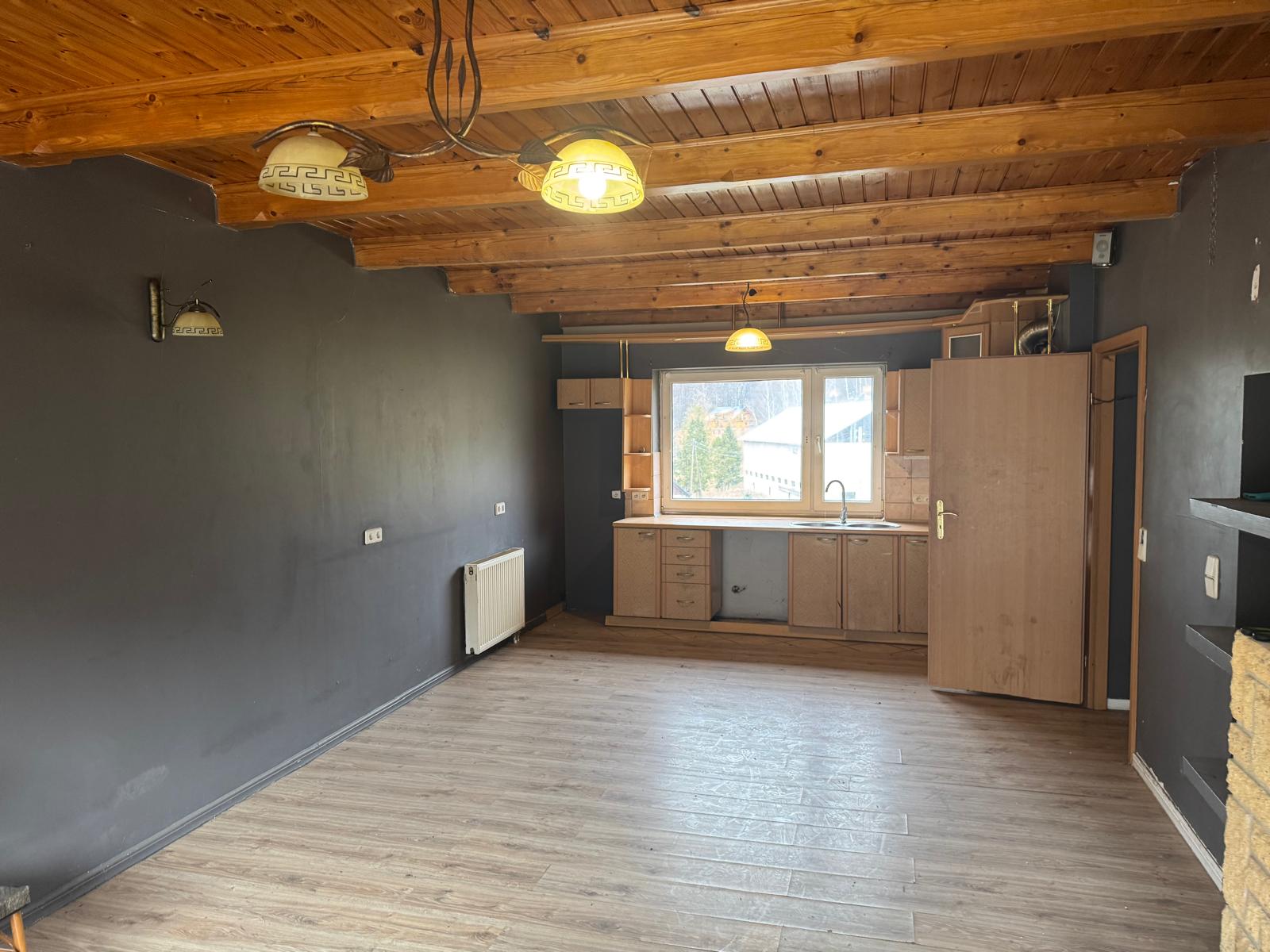 – salon z aneksem kuchenny, oraz z kominkiem z wyjściem na taras