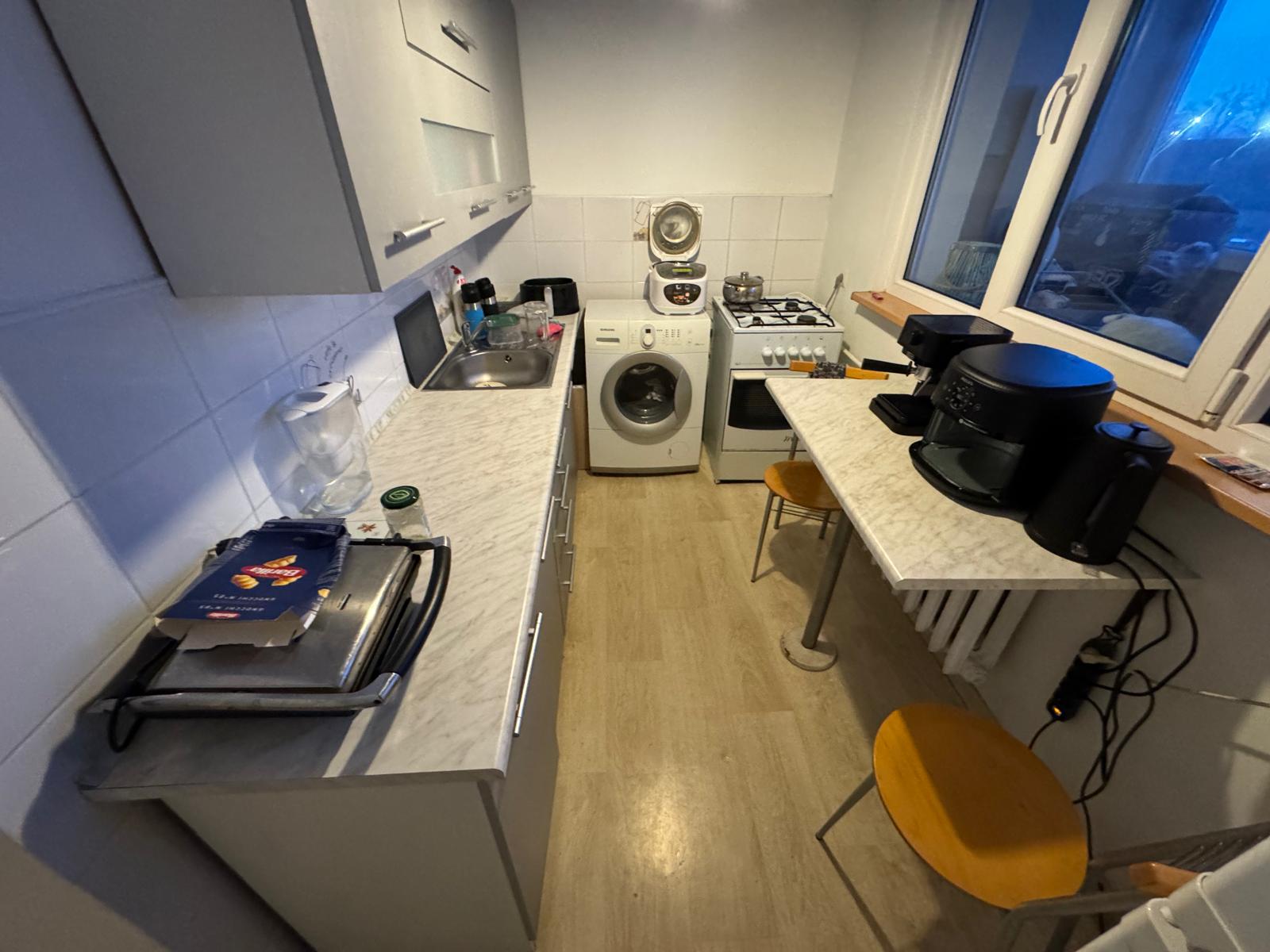 Mieszkanie wyposażone jak na zdjęciach, w meble kuchenne, sprzęt AGD, m.in. w lodówko – zamrażarkę, kuchenkę gazową, piekarnik.