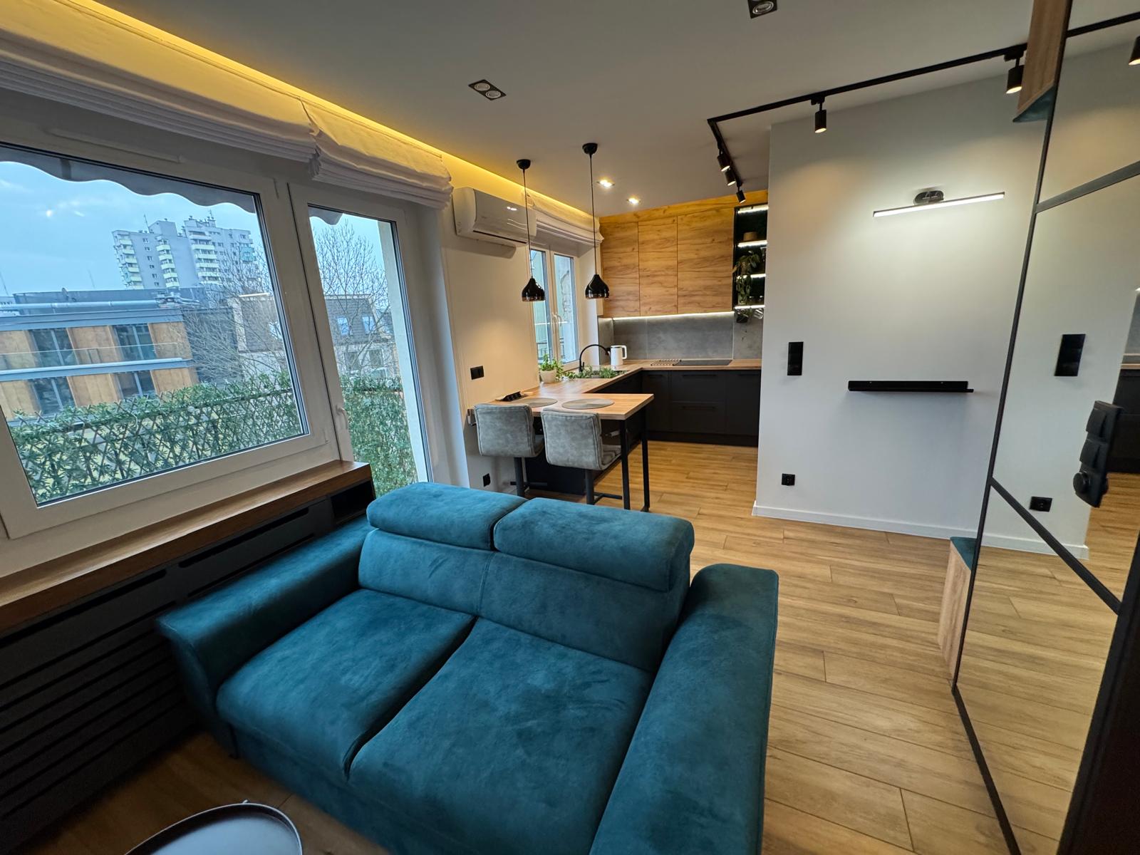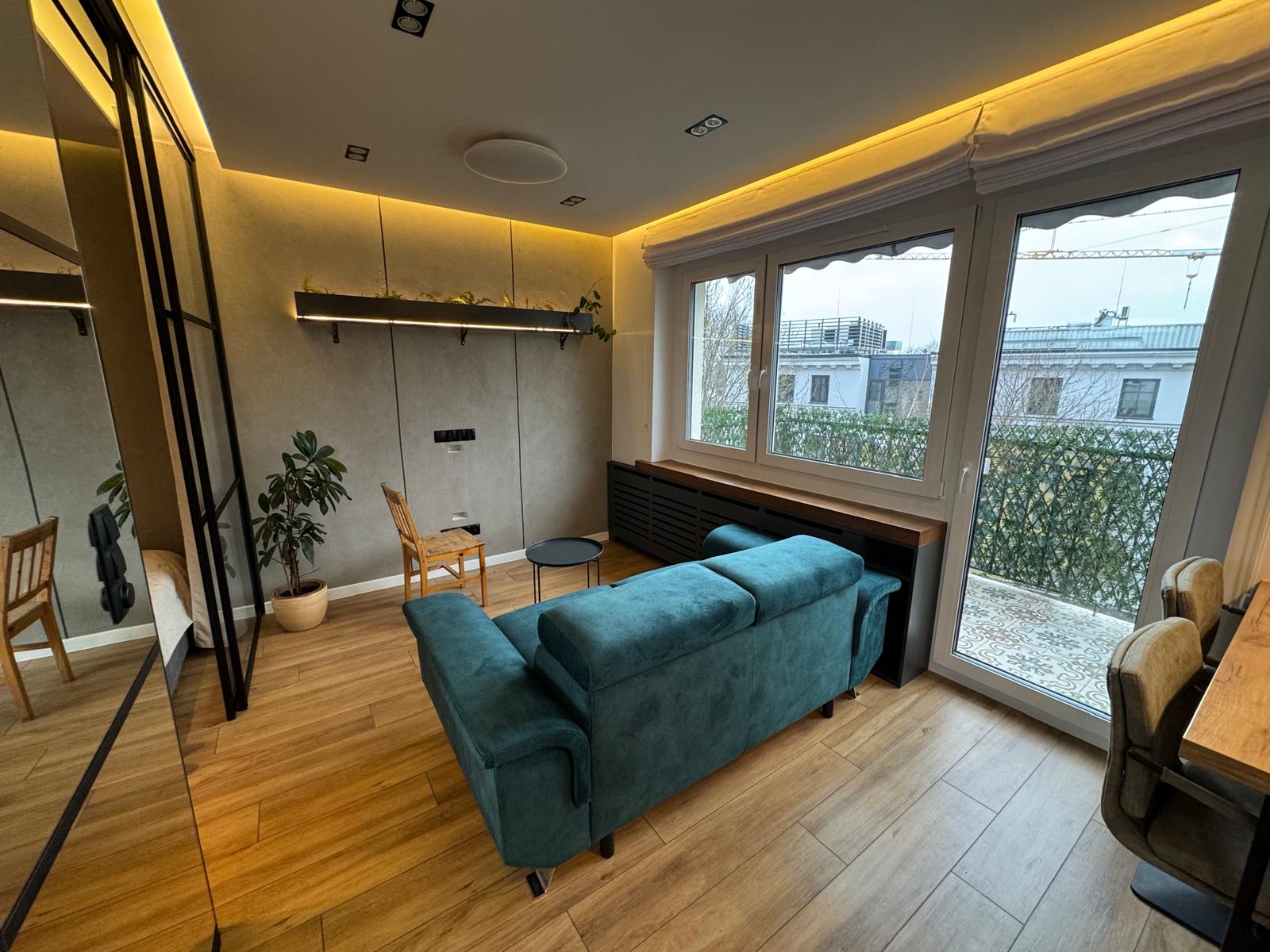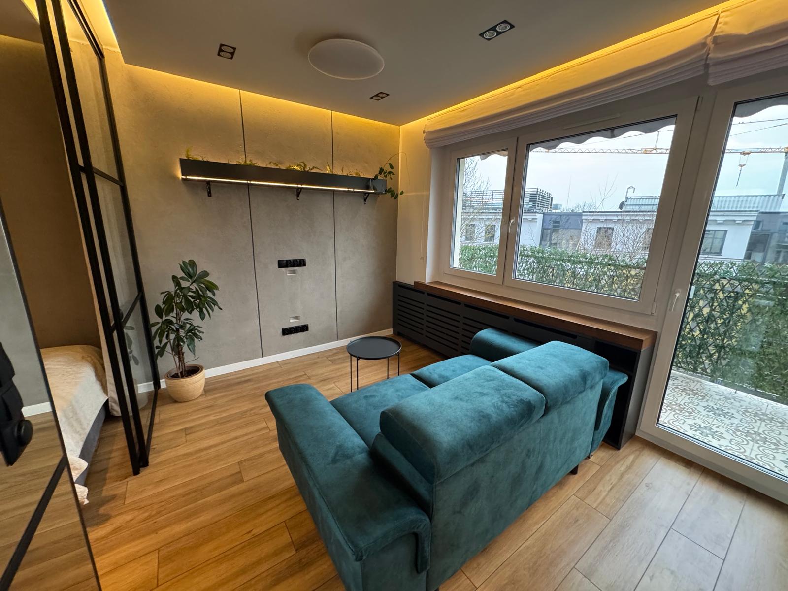 – duży pokój z aneksem kuchennym i z wyjściem na balkon